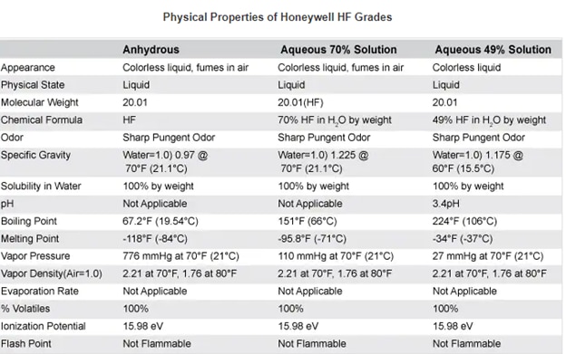 AHF is used to produce environmentally preferred fluorocarbon products, fluoropolymers, and chemical derivatives. It is a clear, colorless, corrosive fuming liquid with a sharp, pungent odor. AHF is 100% soluble in water and is not flammable. It forms a dense white vapor clouds if released. AHF is highly hazardous and needs to be handled and used with rigorous safety precautions. It can cause severe burns to all parts of the body in liquid and vapor forms. Specialized medical treatment is required for all exposures to HF acid.Aqueous HF — 70% Solution