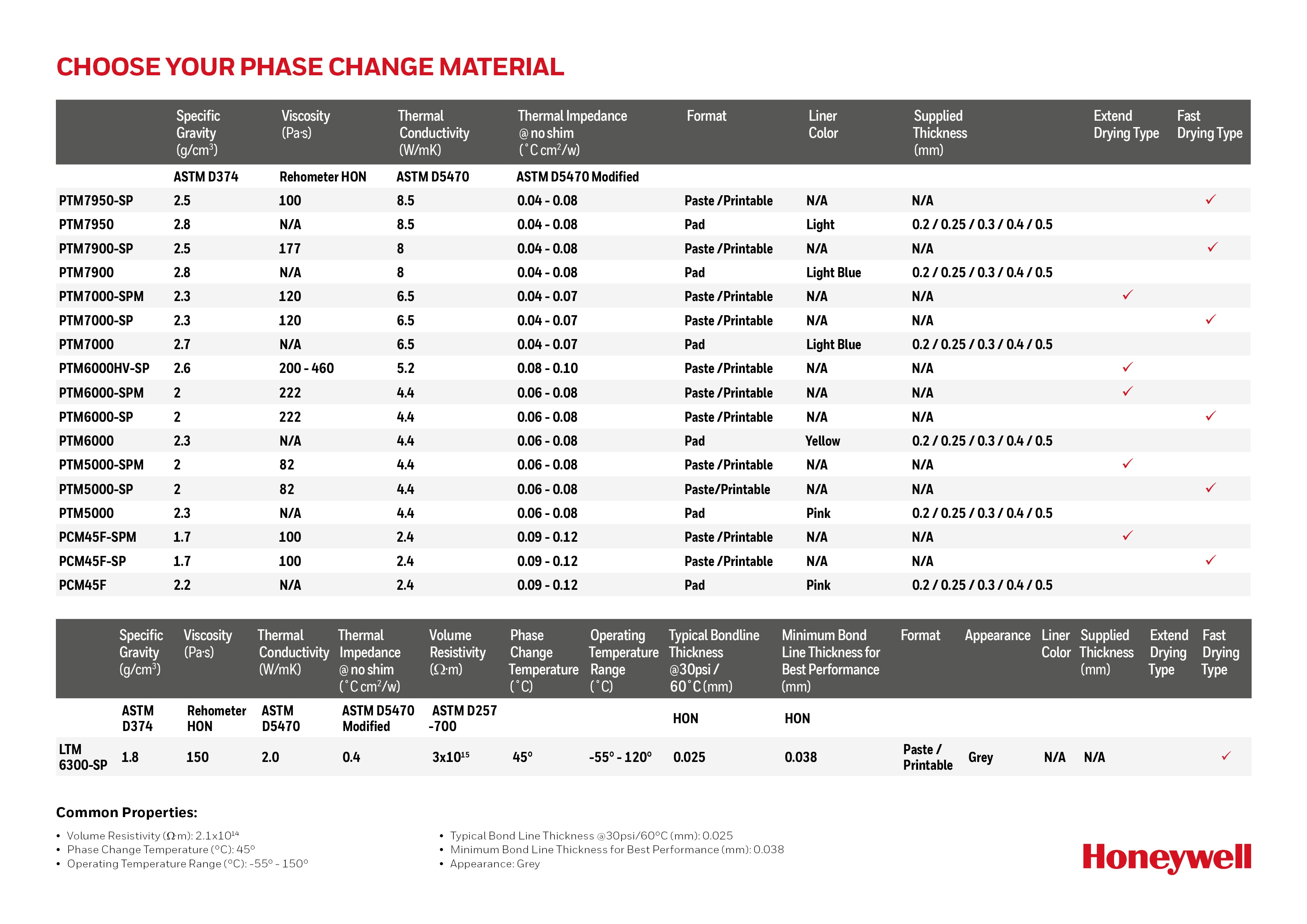 The following PCMs are designed to minimize thermal resistance at interfaces and maintain extremely stable performance through reliability testing required for long product life applications. Honeywell PCMs offer stable thermal impedance across accelerated aging tests and do not display bleeding, pumping, or flow out.