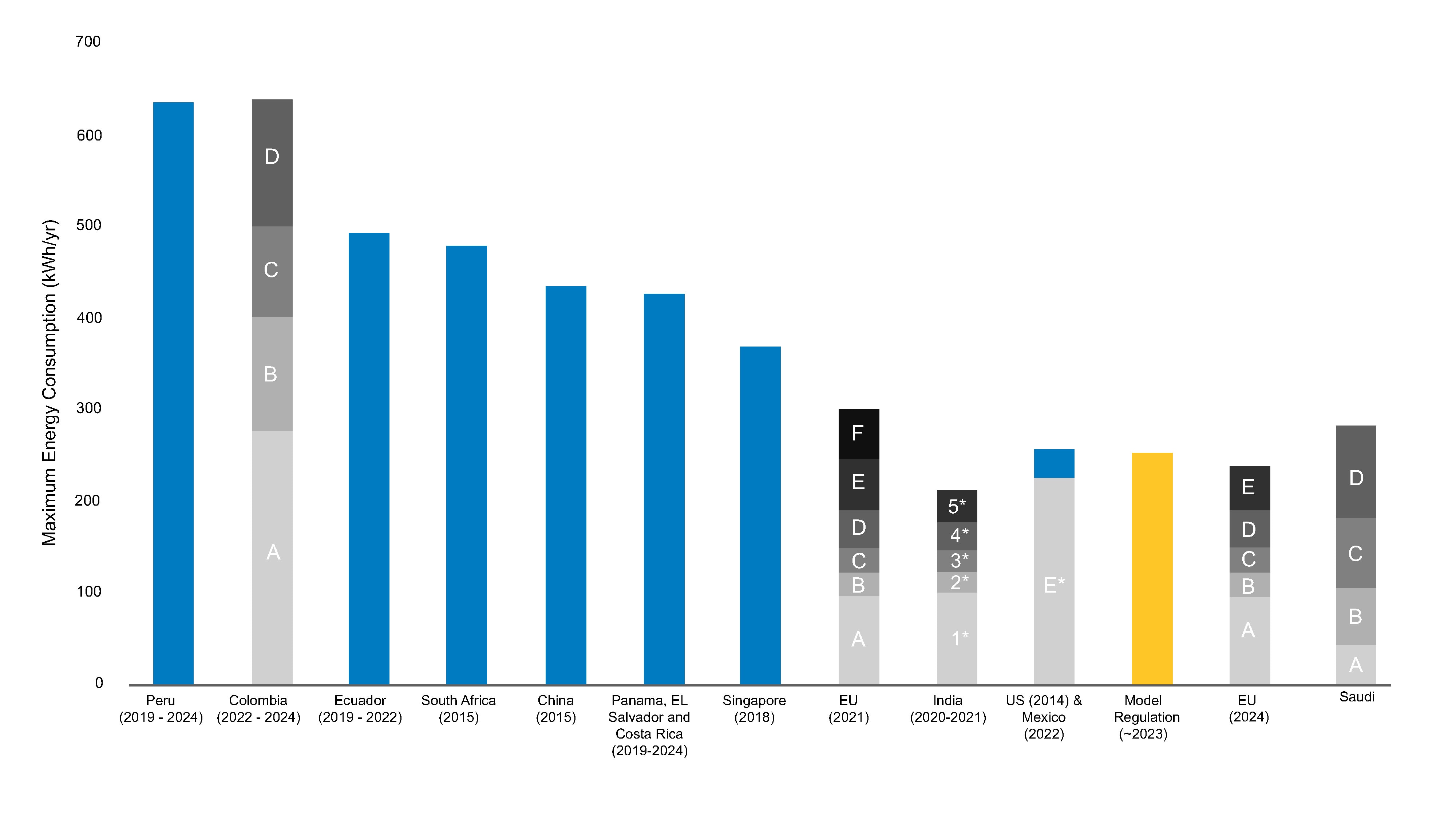 - En el caso de los frigoríficos-congeladores, se supone que el consumo energético a 25 °C según las normas de Colombia, Panamá, El Salvador, Costa Rica, India, México, Singapur y EE. UU. es inferior en un 25 % al consumo energético a 32 °C. Se supone que el consumo energético a 32 °C según la norma de la UE es superior en un 25 % al consumo energético a 25 °C. El requisito de Sudáfrica es equivalente a la actual clase B de la UE.